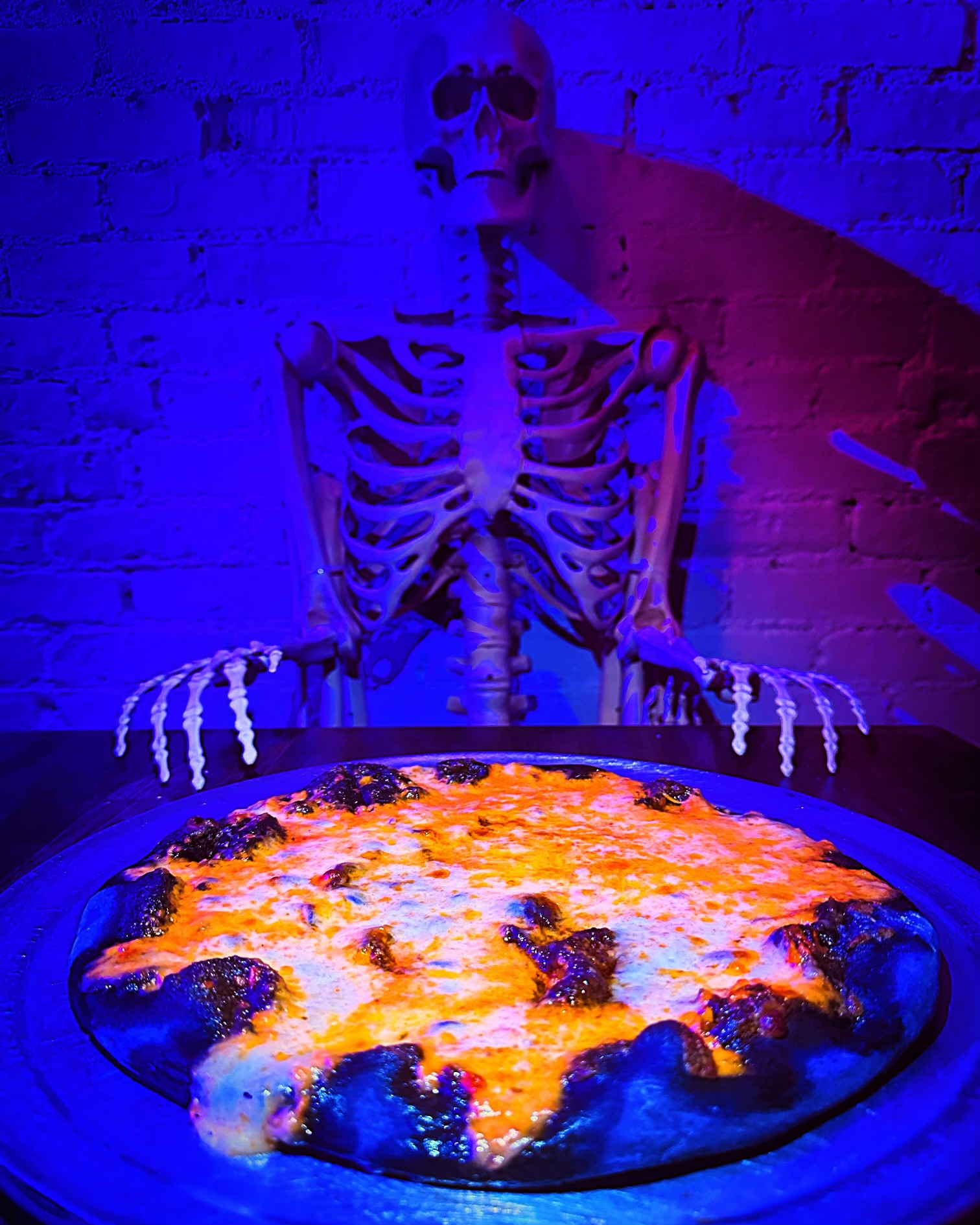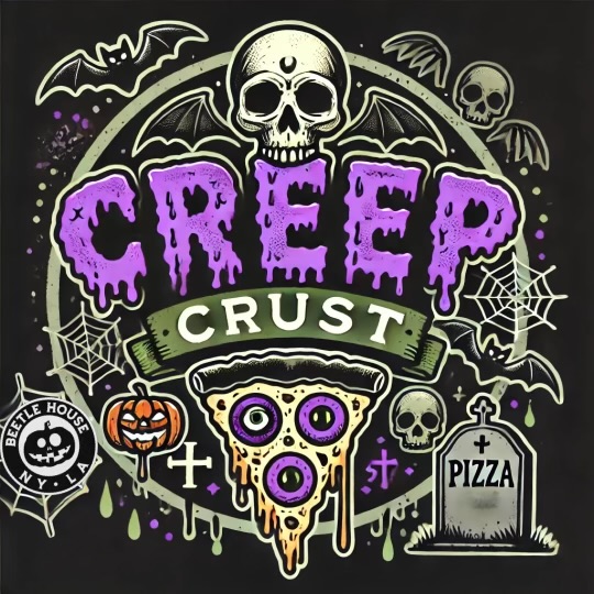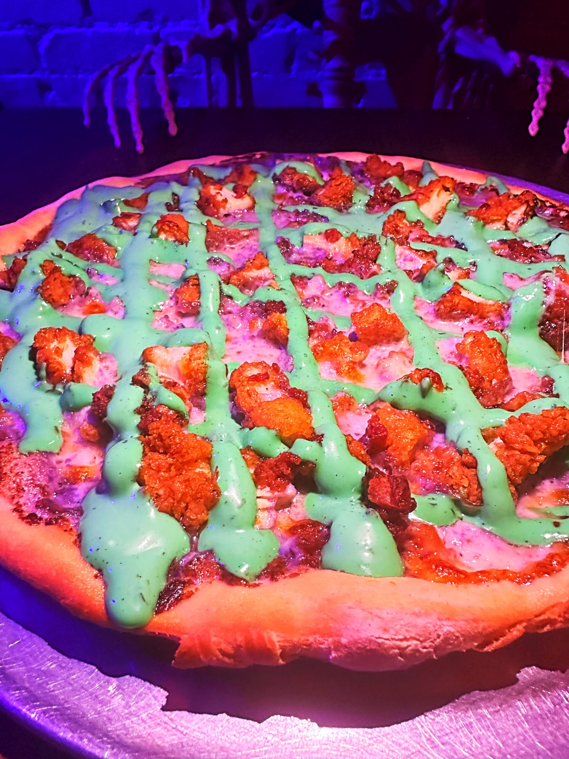 Purple alfredo cream sauce, mozz cheese, monterey cheddar jack cheese, bacon, and chicken topped with green zombie ranch.