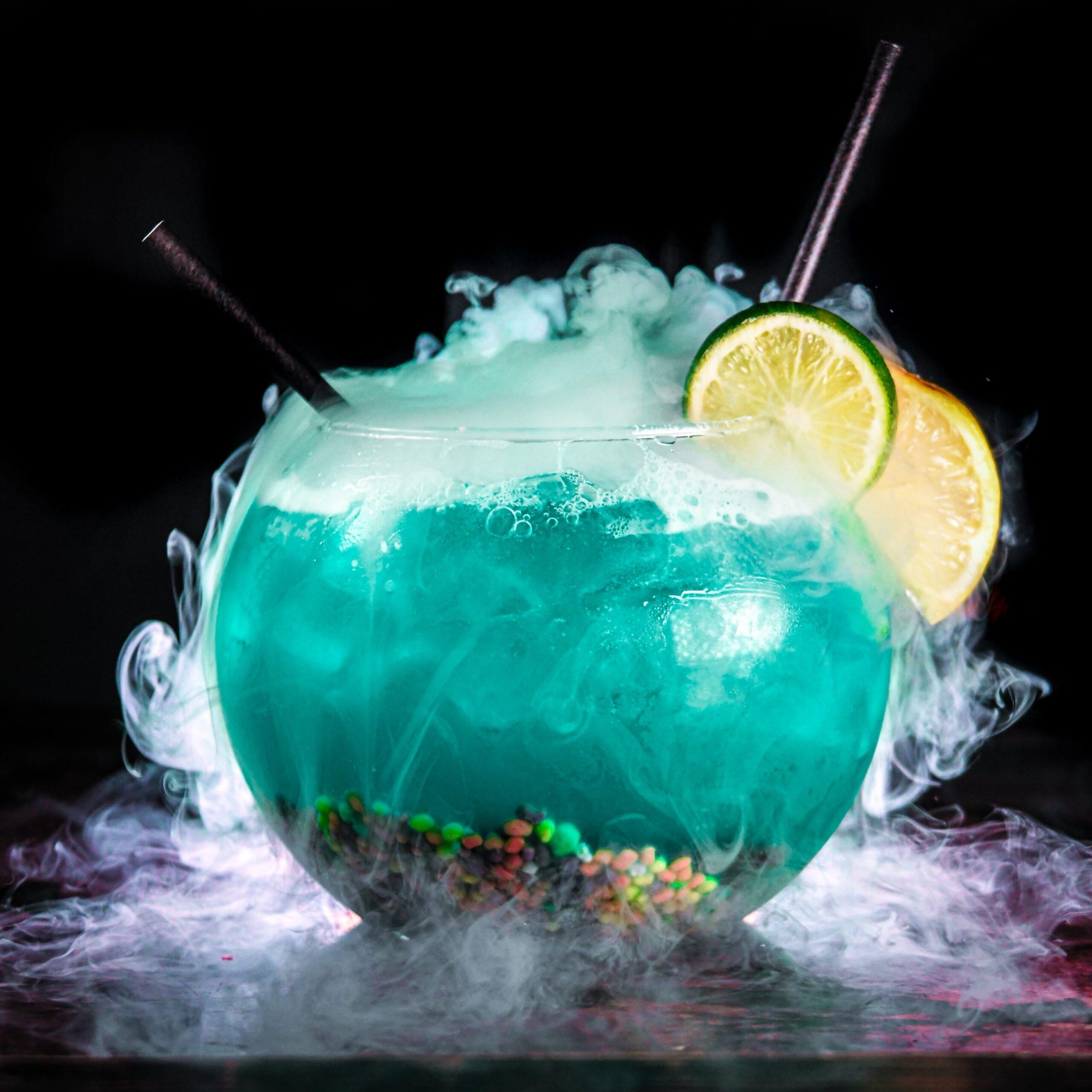 Coconut Rum, Vodka, Gin, Tequila, Blue Curaçao, Pineapple Juice, Sprite, Nerds candy and Swedish Fish candy.